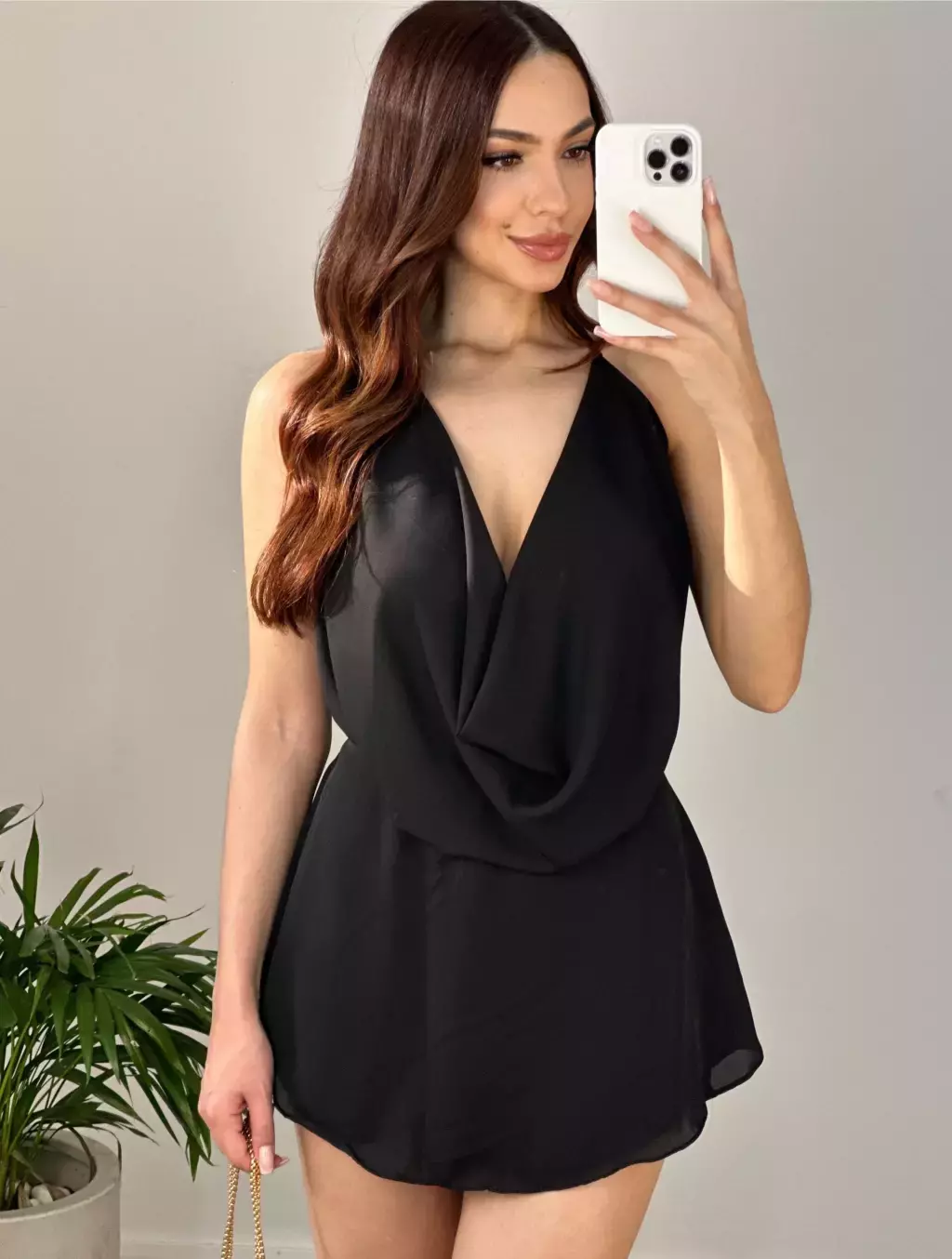 Decote em V profundo na parte frontal, com forro do mesmo tecido nos seios e costas